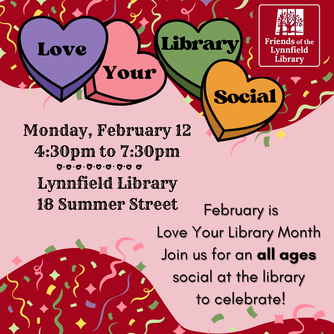 Join us on Monday, February 12 from 4:30-7:30pm at the Library. Our Holiday Mocktail Social was so fun – we are at it again. February is “Love Your Library Month” – join the Friends of the Lynnfield Library for an all ages social to celebrate!