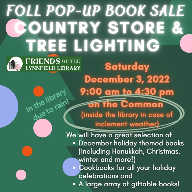 Also – will be teaming with Lynnfield for Love to set up tables on the Common November 5th and 6th in conjunction with the Lynnfield Art Guild Sale and the Centre Congregational Church Holiday Craft Sale. We will be selling Fine Arts and Hobbies/Crafts books and spreading the word about FOLL and need some extra hands!