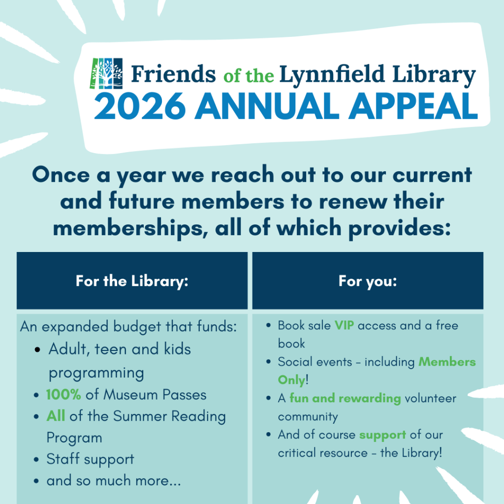 Please check your mailbox this month if you typically renew during appeal time or if your membership has lapsed. Memberships and book sales drive the majority of our fundraising efforts, so please consider renewing (or joining!) to help us continue offering the many amazing programs and workshops coming up at the Lynnfield Public Library.