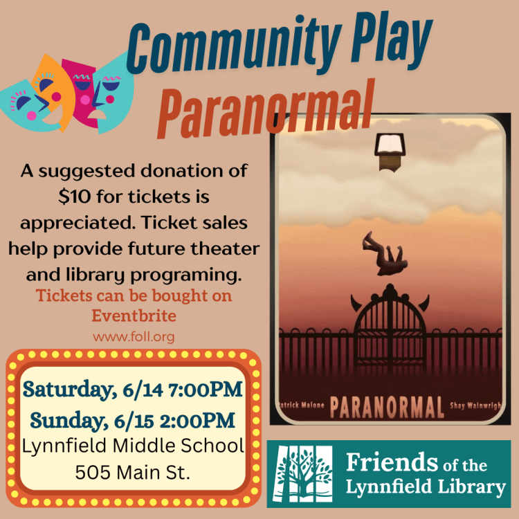 Are you a theater lover? Join us for a special new Community Theater event. The Lynnfield Public Library, in partnership with the Lynnfield Public Schools Theater Department, is producing Paranormal, a compelling play written by LHS student Patrick Malone about a chorus that makes a dangerous deal. The cast is made up of adults from the Lynnfield Community.