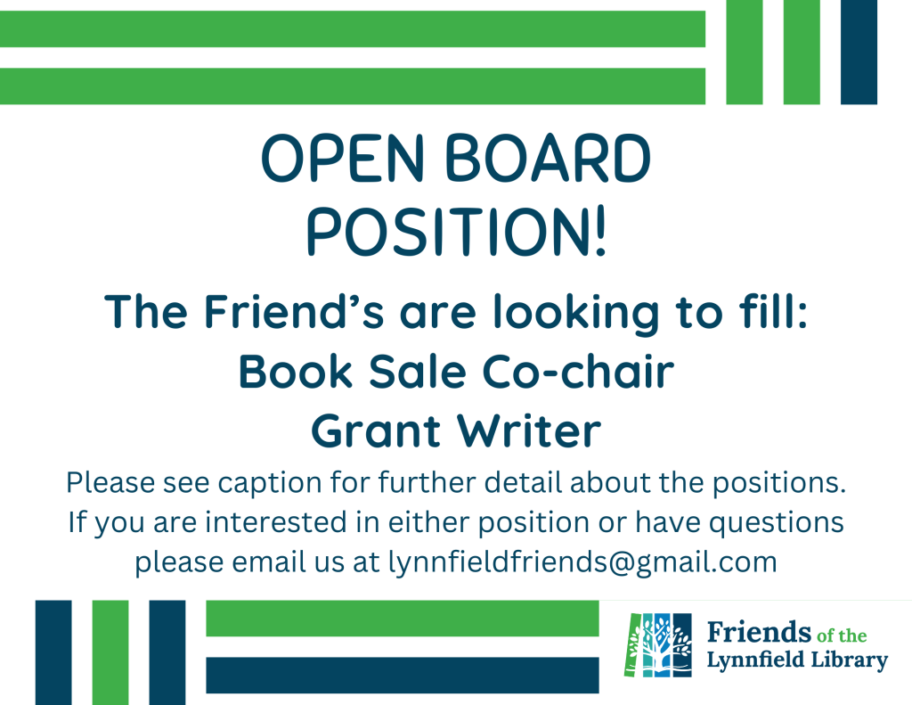 If you would like to join our board, or are thinking about doing so and have questions, email lynnfieldfriends@gmail.com. Please consider stepping up for one of these positions so we can further the success of FOLL!